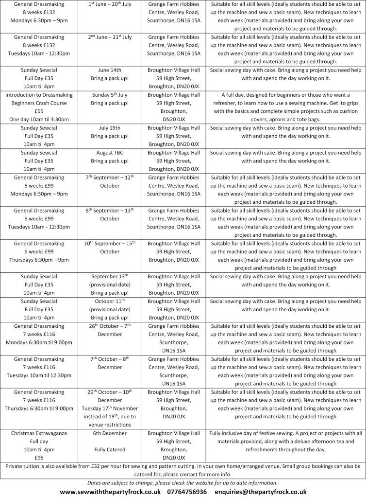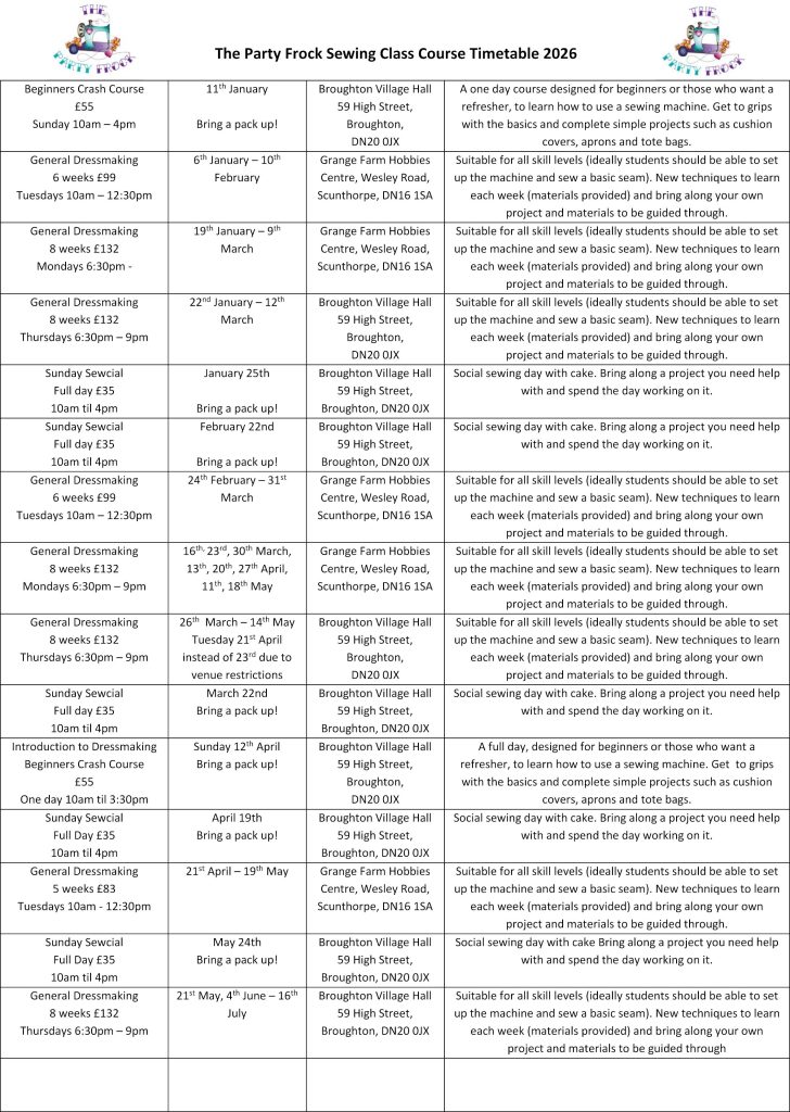 Sewing Classes Please click on the course below that you wish to find out more information about. A full list of dates can be found at the bottom of this page.